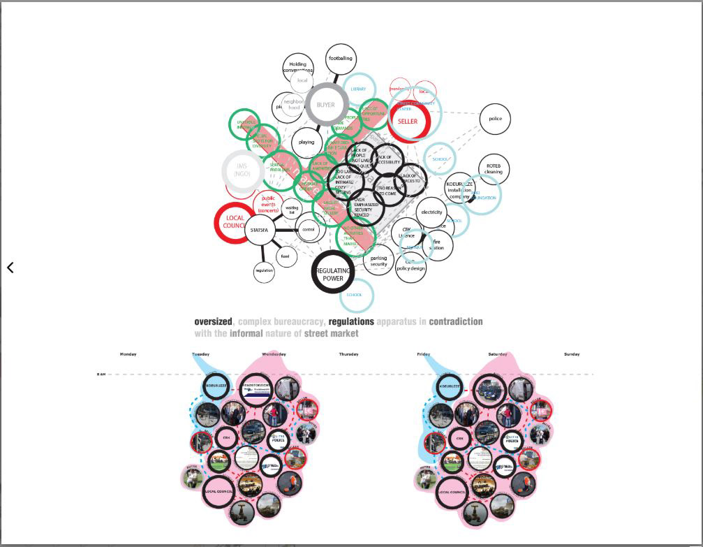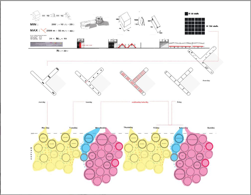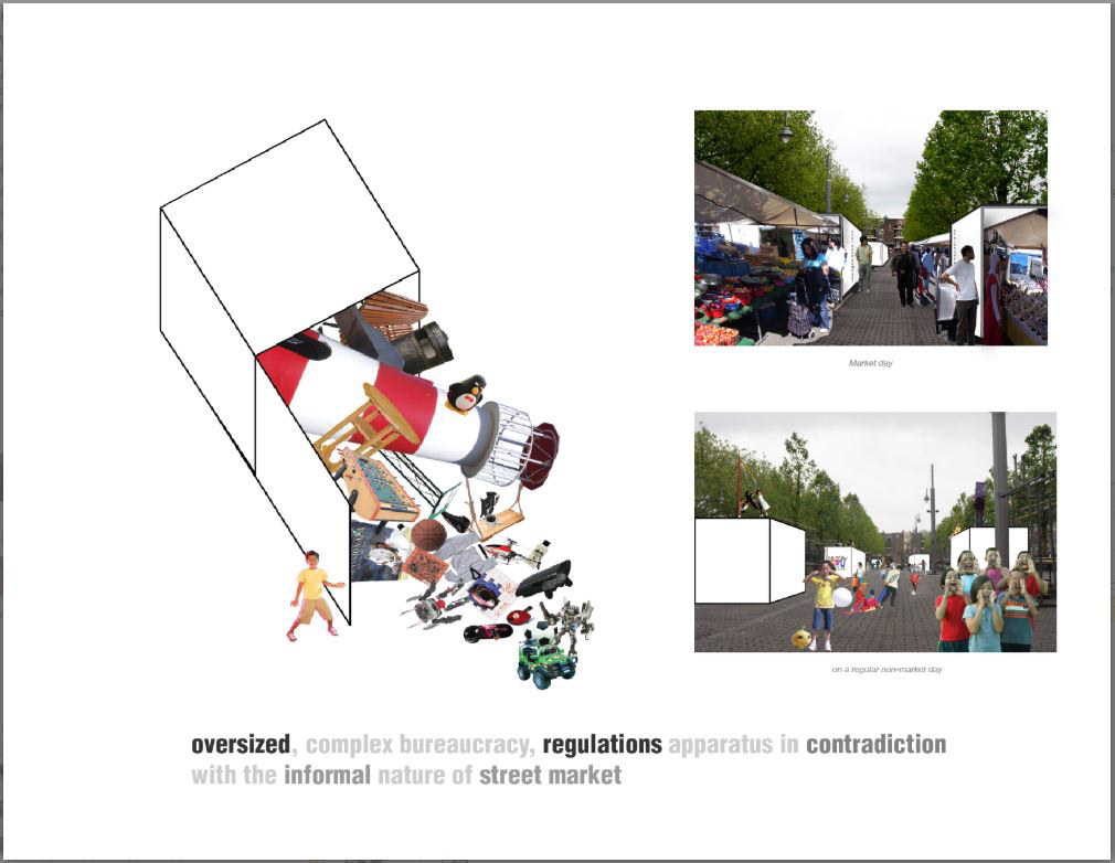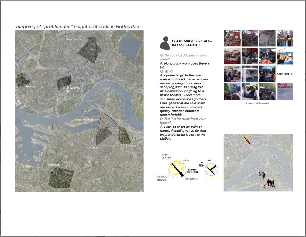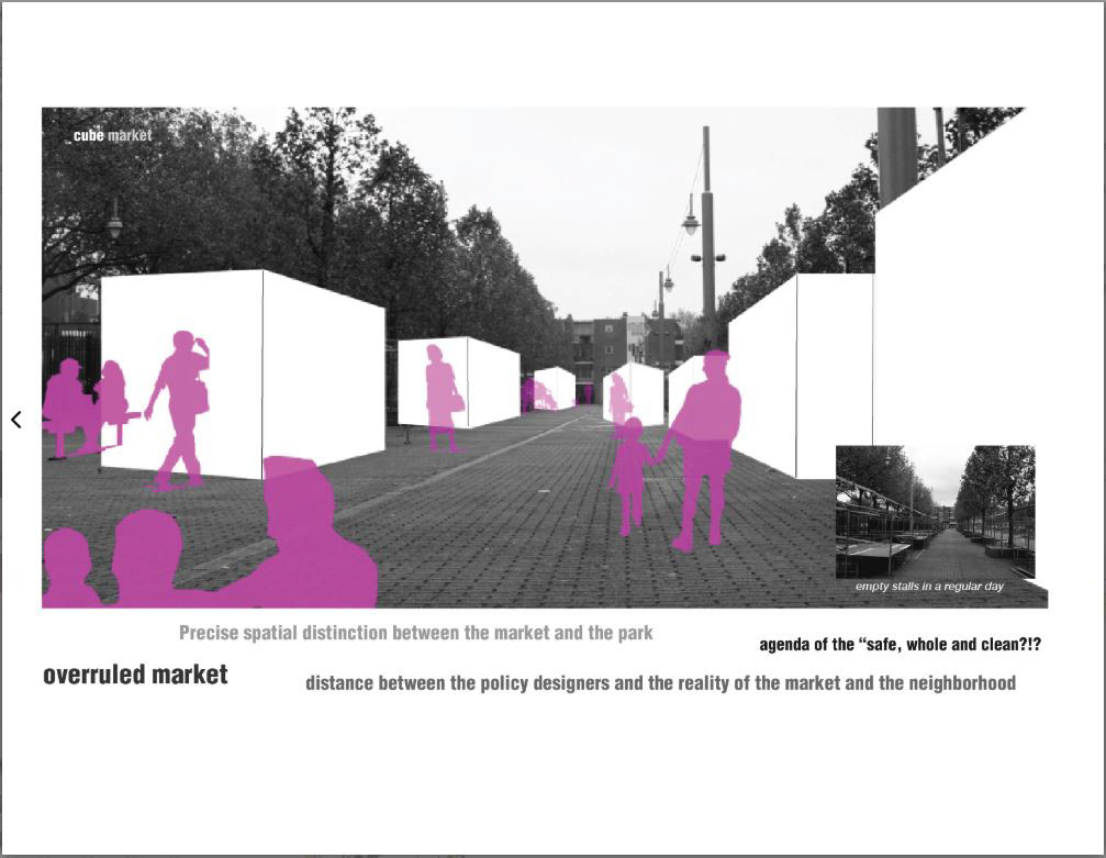 Afrikaanderburt has a street market, called Afrikaansemarkt. This open free-market which is held two days a week, is currently in a vulnerable situation; increasingly restrictive regulations(not only on local level, but also in EU level) and socio economic tensions are threatining its existence. Main objective of this master class was not only to reexamine the relationship between the instutitions that forms structure of the market, and create alternative policies that would enhance the efficieny and the attractivenes of the market, but also to as a direct result of these new alternative policies, create spatial solutions for the market in a micro urban level. Also to understand of what are the processes that constitute the problematic Rotterdam neighborhoods and expose the contradictions at play in the problematic zone.