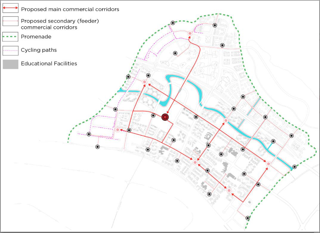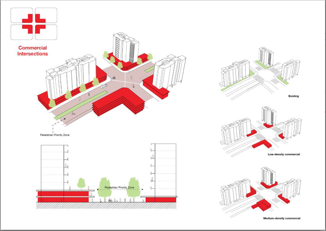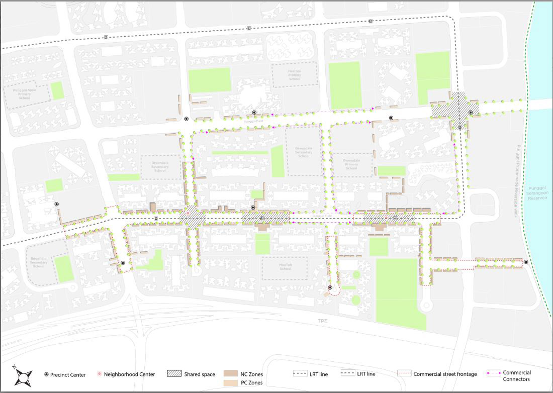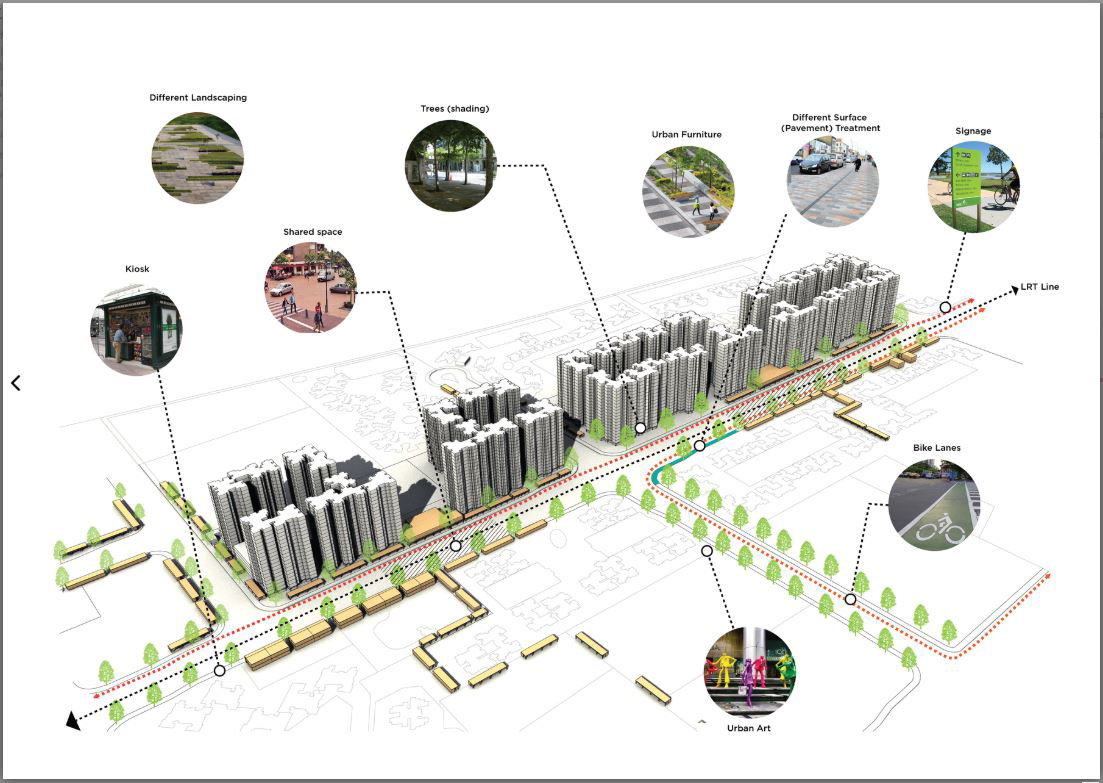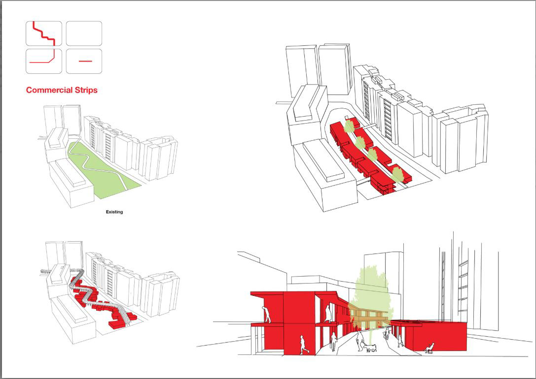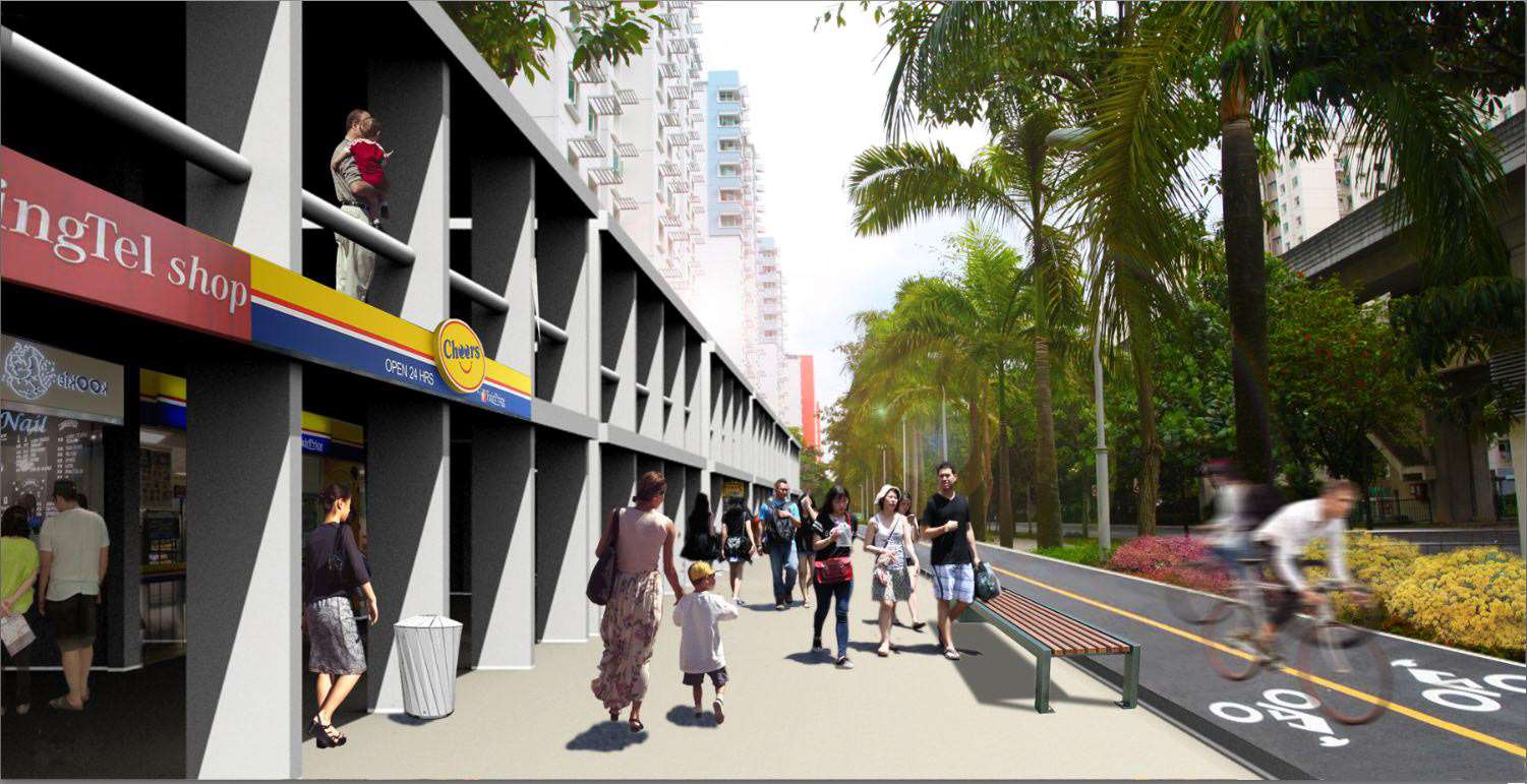 This project involved preparing a new planning norm for the provision of commercial facilities in Singapore's Public housing towns, which accommodate 85 percent of the city state's population. The study aims to create a model for: 1. Determining the quantum of commerce, 2.Determining the mix of commerce, 3.Determining the location of commerce and, 4.Determining the typology of commerce in Singapore's future HDB towns. I was in charge of developing alternative typological strategies for commercial facilities in this project. We have proposed that retail concentration takes place in order to achieve a certain attraction to the retail trades, that consumers can buy sev- eral things in one trip and can com- pare goods and prices. At the same time, concentration makes it possible to connect the retail centre with pub- lic transport. Commercial spaces can be combined with pedestrian connectors, greenways, water bodies, street furniture, etc. to create an attractive walking atmosphere. Neighbourhood Centres and Precinct Centres in HDB towns would benefit from stretching out along main pedestrian spines between homes and popular pedestrian destinations, such as MRT and bus stations. This would: (a) allow shops to capture the pedestrian movement to and from transit stations, created by costly infrastructure investments; and (b) enable HDB towns to foster diverse, pedestrian friendly public spaces where commerce contributes to activity generation.